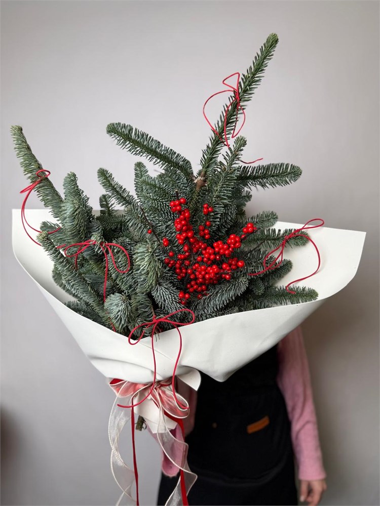 Большая охапка нобилиса с илексом (можно заменить на илекс любого цвета из наличия). Создаст новогоднее настроение и подарит улыбку, как по волшебству!